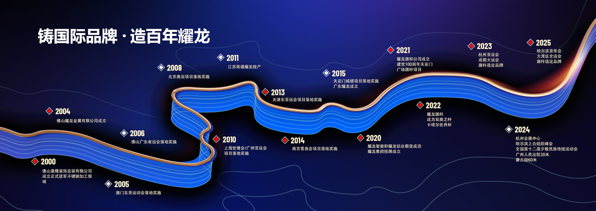 主營旗桿、不銹鋼旗桿、鋁合金旗桿、頒獎旗桿等旗桿廠家,公司所生產的旗桿產品已經20年,形成良好的市場口碑。國家以及政府地區的大型項目形象工程均指定使用耀龍旗桿。已成功成為天安門城樓、北京奧運會、北京冬奧會、國家博物館、福建海峽國際會展中心、上海世博會、亞洲運動會、深圳大運會、南京青奧會、廣州奧體中心、汕頭亞青會、廣州國際會展中心、卡塔爾世界杯廣場、福建廈門新會展中心的旗桿選定升旗品牌,為國家運動賽事的順利開展作出了巨大貢獻。